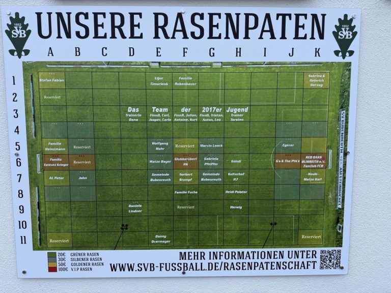 Ihr müsst „Euer“ Rasenstück weder düngen noch mähen – die Einnahmen der Aktion „Rasenpate“ fließen zu 100 % in die Platzpflege unserer Sportanlagen. Selbstverständlich dürft Ihr Euch den Platz Eurer Parzelle/n selbst aussuchen, sofern dieser noch nicht belegt ist.